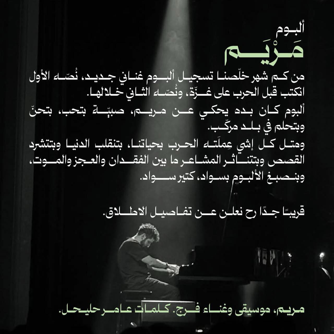 ويحتفل فرج سليمان بالعرض الحي الأول لألبومه الغنائي الجديد “مريم”، الذي يضم في جعبته عشر أغنيات تحمل كل منها حكاية واقعية وعاطفية منفصلة ومتصلة بقصة الألبوم ككل، والتي تدور في فلك تجسيد عاطفي للحياة قبيل وبعد الحرب والمأساة التي يعيشها الشعب الفلسطيني حاليا.